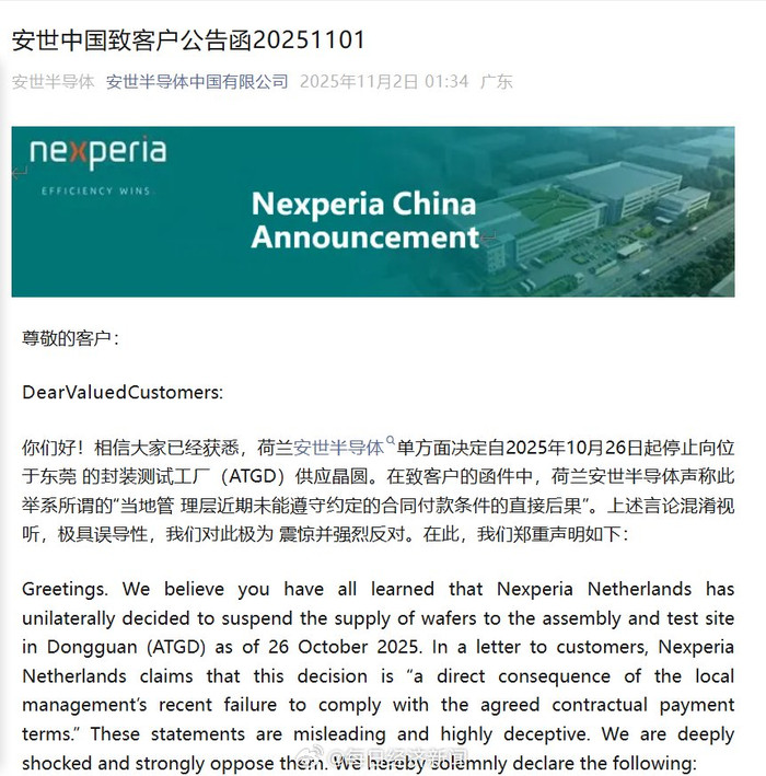 荷兰安世半导体相关管理层在决策过程中严重失职失责,将个人利益凌驾于公司整体利益之上,严重违背职业操守和公司治理要求,由此给公司、广大员工造成的损失,应依法承担责任。荷兰安世半导体单方面停止供货的行为,完全置客户利益于不顾,严重违反合同约定和商业合作原则,严重破坏了客户信任,是极其不负责任的做法。